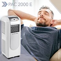 Rahat ve serin ortam havası sağlayan mobil klima PAC 2000 E. Şık tasarımı ile alanlara uyum sağlar ve performansı ile göze çarpar.