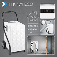 Yüksek performanslı nem alma cihazı TTK 171 ECO restorasyon ve inşaat kurutma kapsamına dahil tüm çalışmalar için uygundur. Bu nem alma cihazı özel bir basınç fanı ile donatılmıştır ve kurutma işlemleri ideal bir seçimdir.