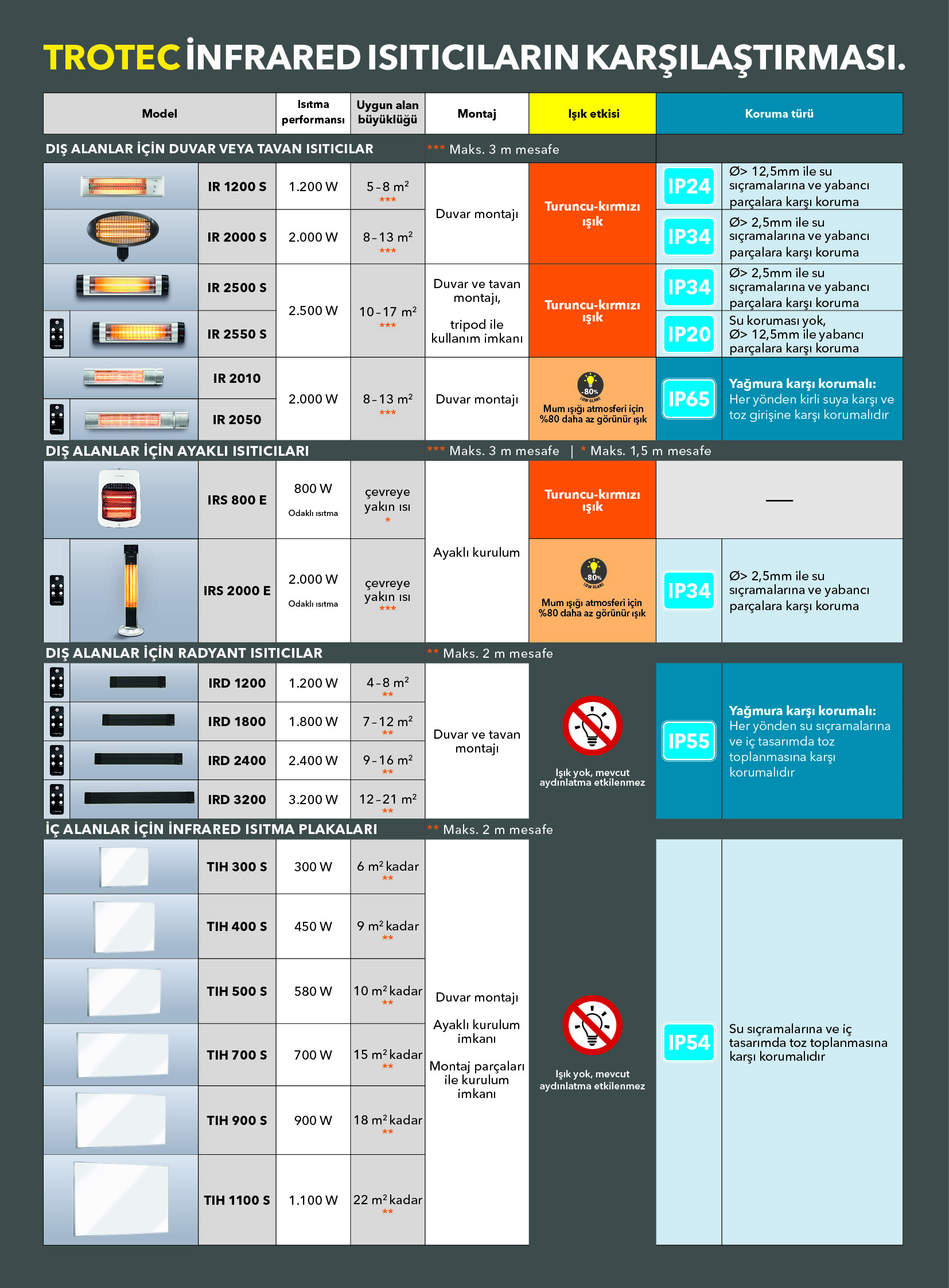 Trotec infrared ısıtıcıların bilgileri bir bakışta: ısıtma performansları, hangi alanlarda kullanıldığı, montaj imkanı ve koruma türleri. Cihazın sert hava koşullarına, su sıçramalarına karşı korumalı olup olmadığını bilmeniz önemlidir. Tüm bilgileri burada bulabilirsiniz.