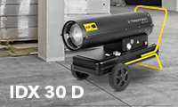 Soğuk inşaatlarda, tarım alanlarında  veya iyi havalandırılmış depolarda – bunun için IDX 30 D mazotlu ısıtıcıyı kullanın: Bu mazotlu ısıtıcı 30 kW ısıtma gücüne ve 735 m³/saat hava debisine sahiptir. Mazot tankı sayesinde bu IDX 30 D mazotlu ısıtıcının kullanım alanı kolayca değiştirilebilir. Ayrıca hafif tekerleri sayesinde bu mazotlu ısıtıcı istediğiniz yere kurulabilir ve çalışmaları sorunsuz sonlandırır. İnşaatlarda veya düz olmayan alanlarda bile!