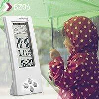 BZ06 sadece bir termo higrometre değildir, aynı zamanda çalar şaat ve takvim fonksiyonu ile saat olarak kullanılabilir. Bu hava istasyonu 20 saniyelik aralıklar ile sıcaklık ve bağıl nem oranını ölçüp minimum ve maksimum değerlerini gösterir. Sıcaklık, nem, saat, gün ve tarih iyi okunabilir LCD ekranında büyük rakamlar ile gösterilir. Çalar saat gibi alarm fonksiyonu ile bu iç mekan hava istasyonun donanım konforları tamamlanır.